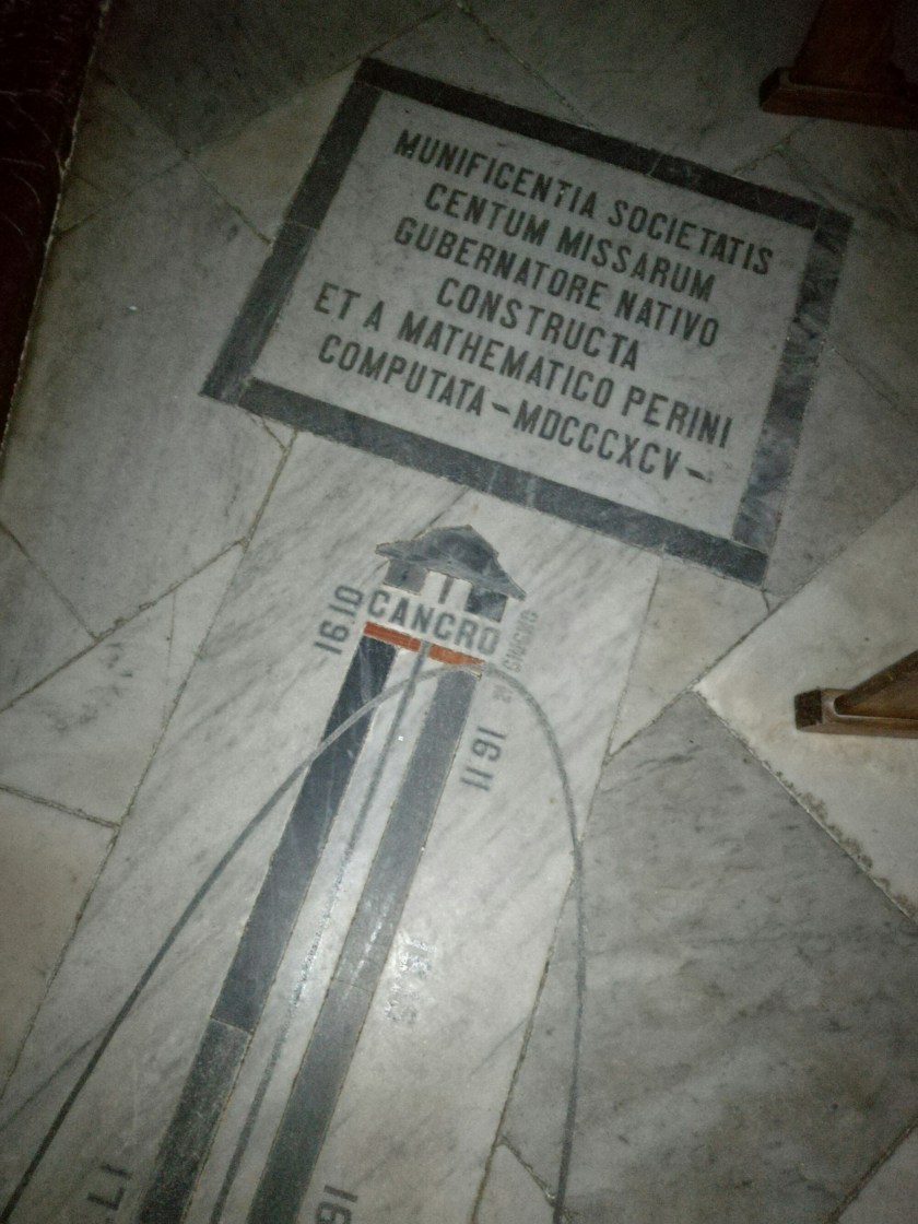Sul pavimento proprio sotto l’altare maggiore, il matematico Armando Perini alla fine 800 disegnò una “meridiana solare analemmatica”; il raggio di sole, che entra dal foro dello gnomone situato in alto sulla destra, a mezzogiorno, segna sulla meridiana il mezzogiorno locale.