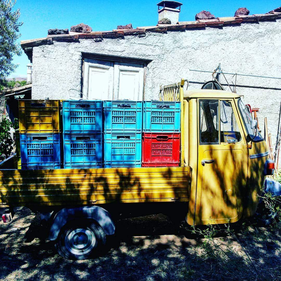 Photography, country rural building, apecar during harvest.