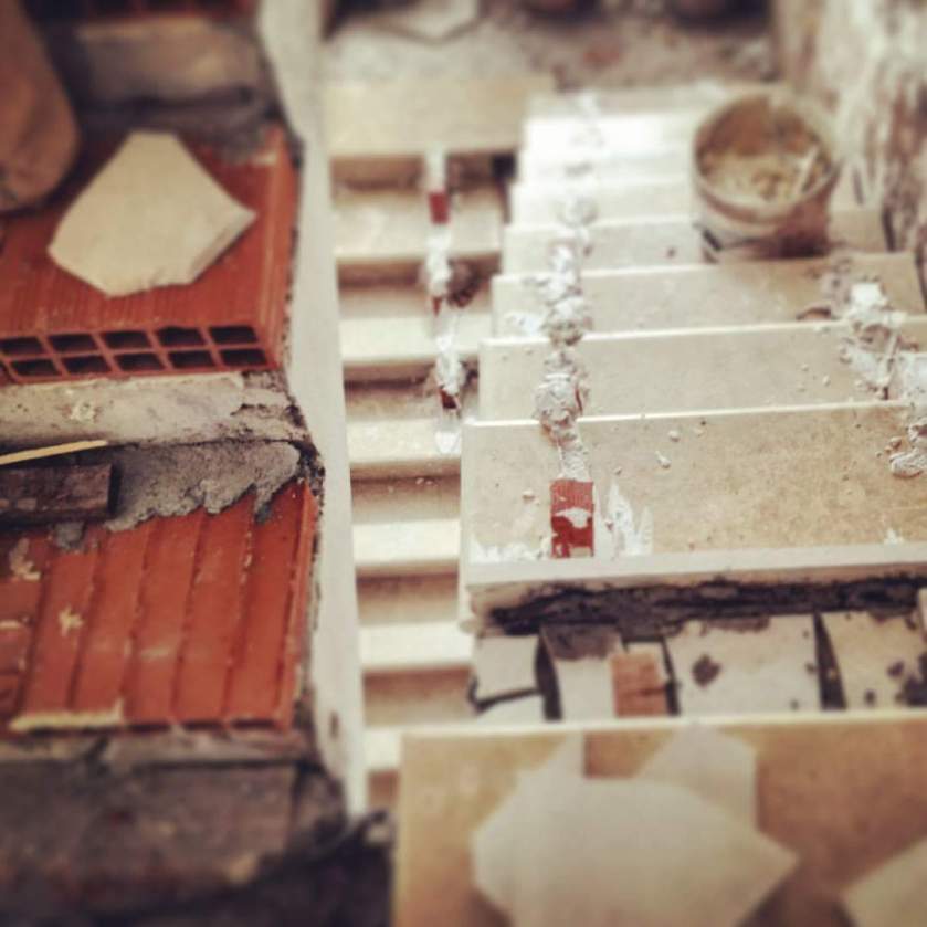 💯 Cantiere, il pensiero è stato con soddisfazione trasmesso ;). Muratori, marmisti, levigatore, così dai mattoni forati la scala in pietra bianca di Modica prende consistenza creando interior design nel contempo.