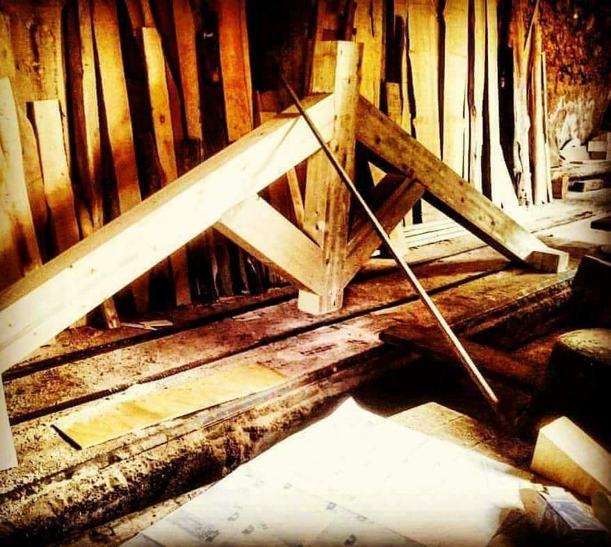 🅾 Il sostegno del tetto formato da un triangolo di travi cioè il “SOFFITTO a CAPRIATE“, usata come struttura portante di coperture di edifici.