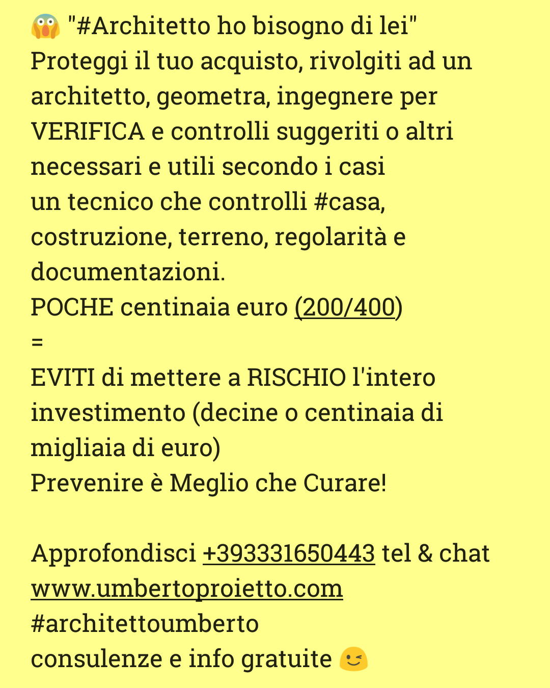 POCHE centinaia euro (200/400) = EVITI di mettere a RISCHIO l’intero investimento (decine o centinaia di migliaia di euro)