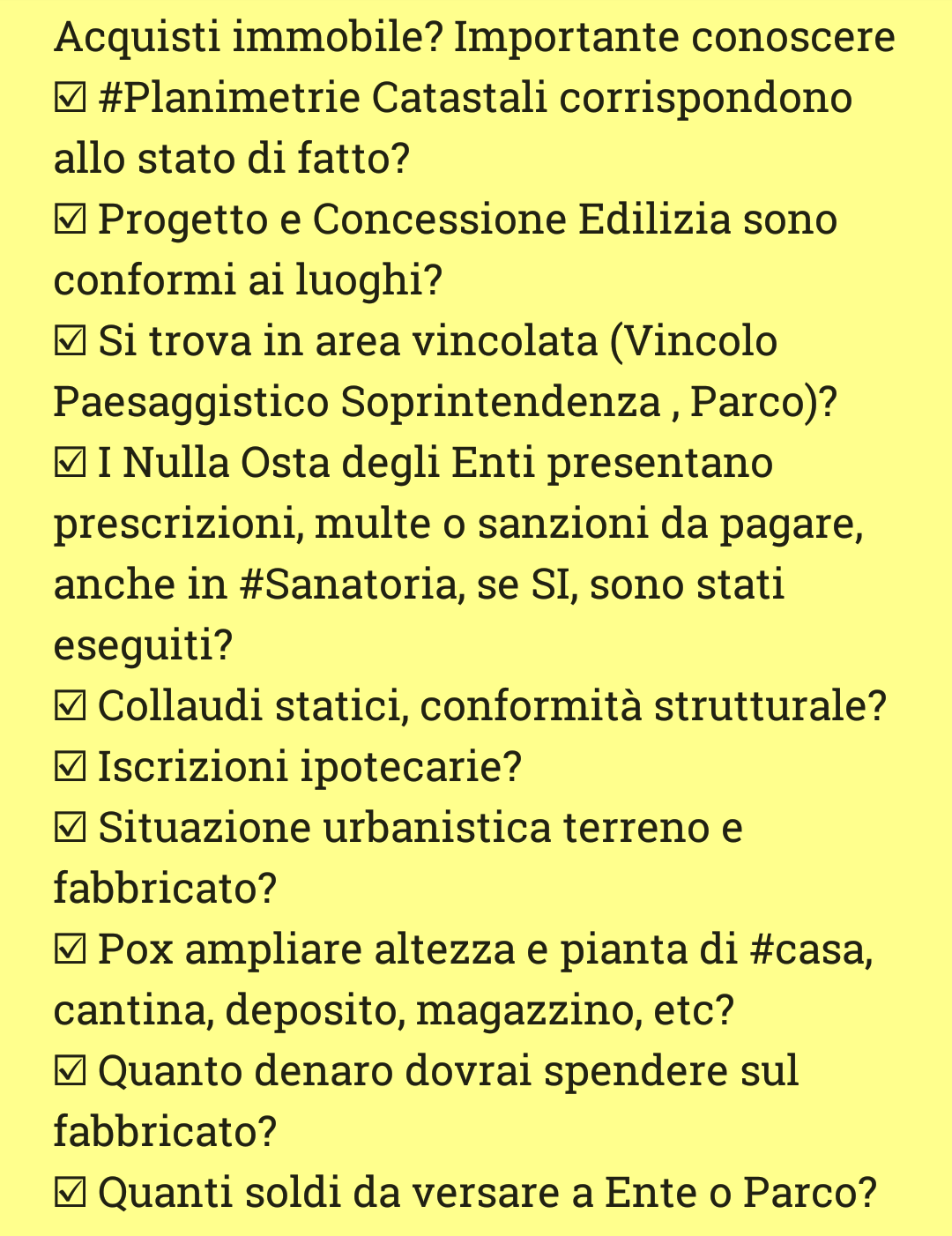 Proteggi il tuo acquisto, rivolgiti ad un architetto, geometra, ingegnere per VERIFICA e controlli suggeriti o altri necessari e utili secondo i casi, un tecnico che controlli casa, costruzione, terreno, regolarità e documentazioni.