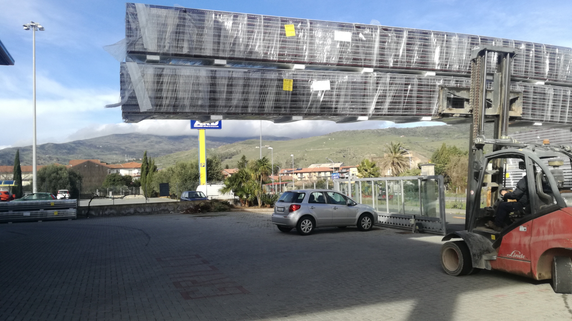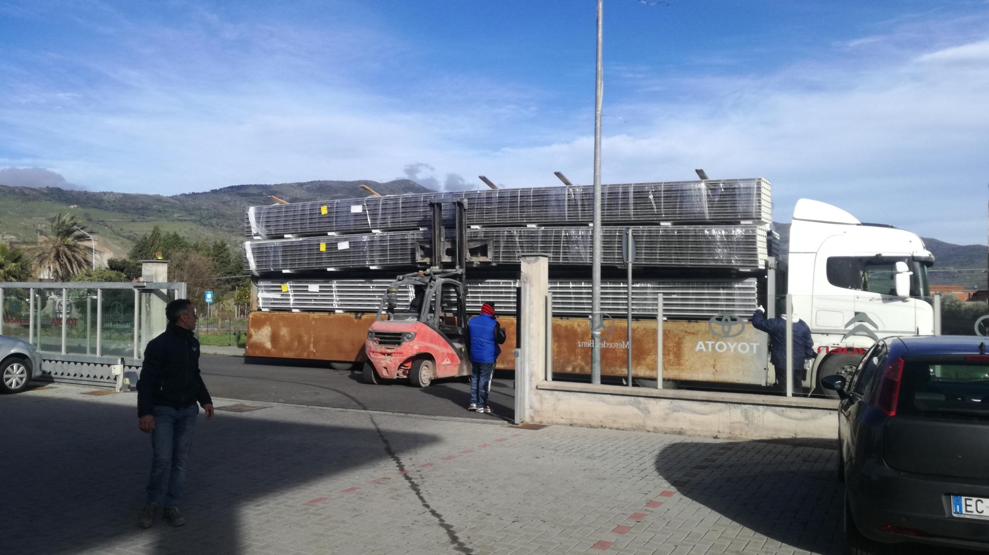 Gli autoarticolati portano in cantiere la termocopertura, in questo caso a “greche”, che con un muletto viene scaricata e accatastata distribuendola in più siti nei duemila metri quadri di superficie del tetto dell’autosalone, nonché officina meccanica, elettrauto, multiservizi.