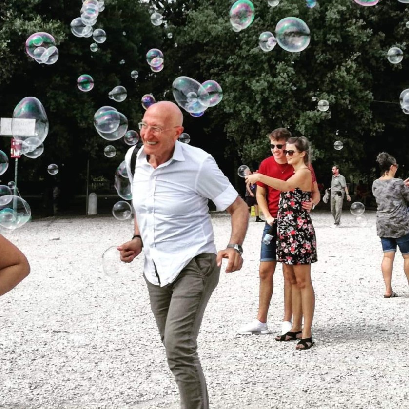 L’architetto gioca con le bolle di sapone giganti a Villa Borghese.