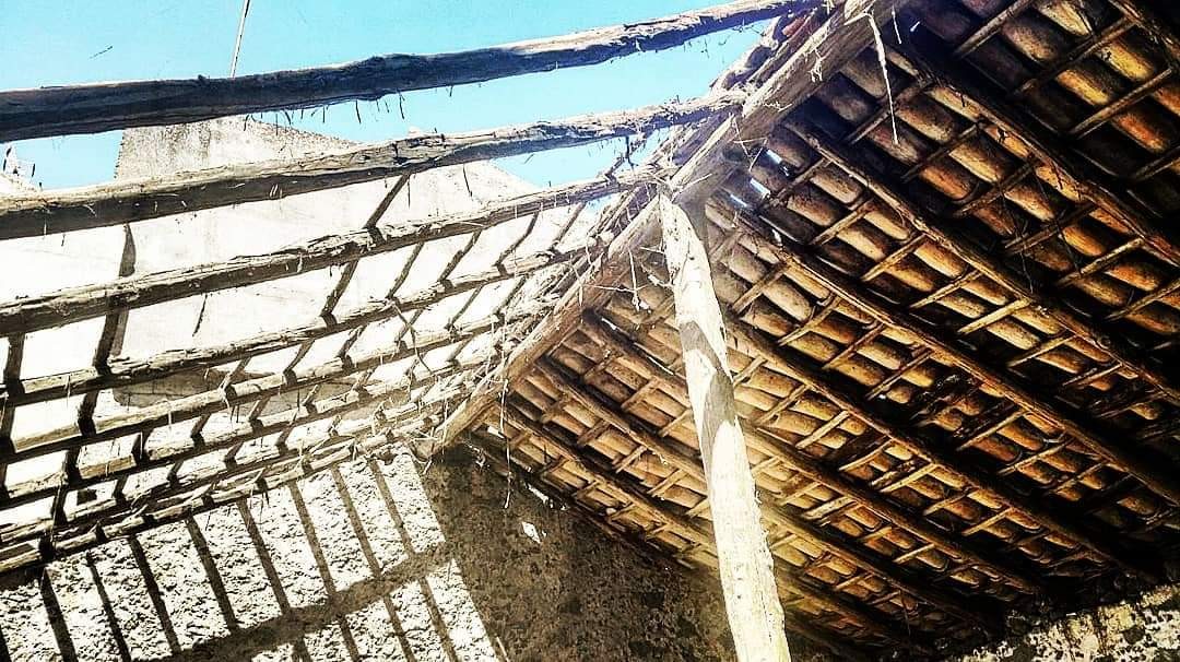 Cantiere aperto per la ristrutturazione di un tetto, muratori e carpentieri a lavoro con montaggio del ponteggio dopo lo svellimento del tegolato di copertura, che verrà accatastato per un successivo riutilizzo.