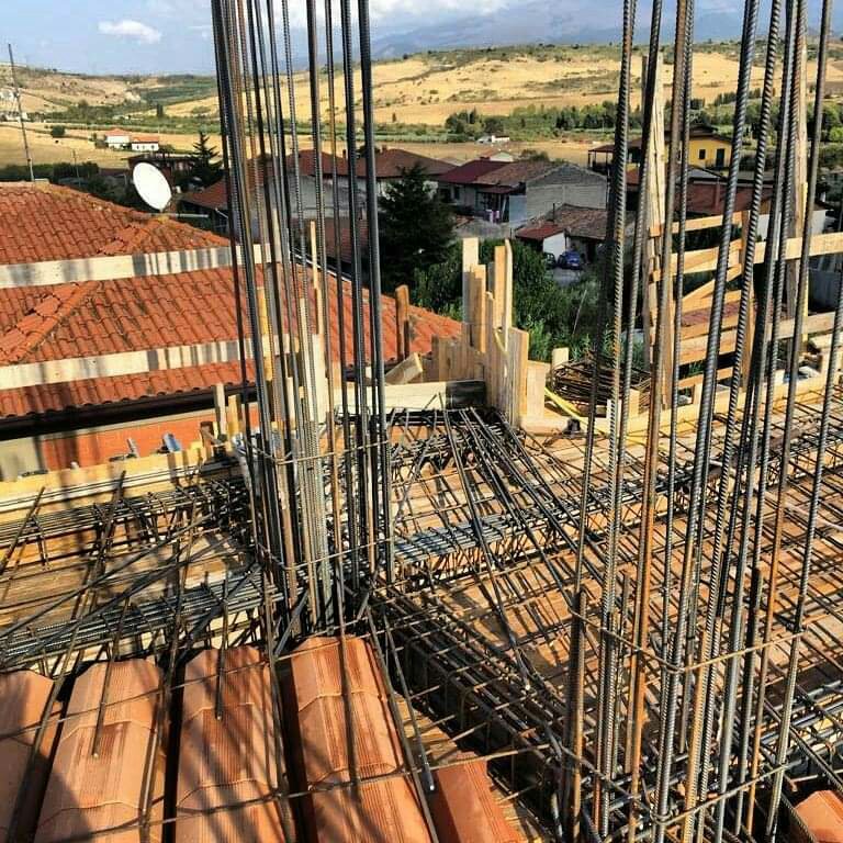 Giunti al terzo solaio e travi, pronti prima del getto di cemento, a copertura del secondo piano fuori-terra del fabbricato che guarda i monti Nebrodi.