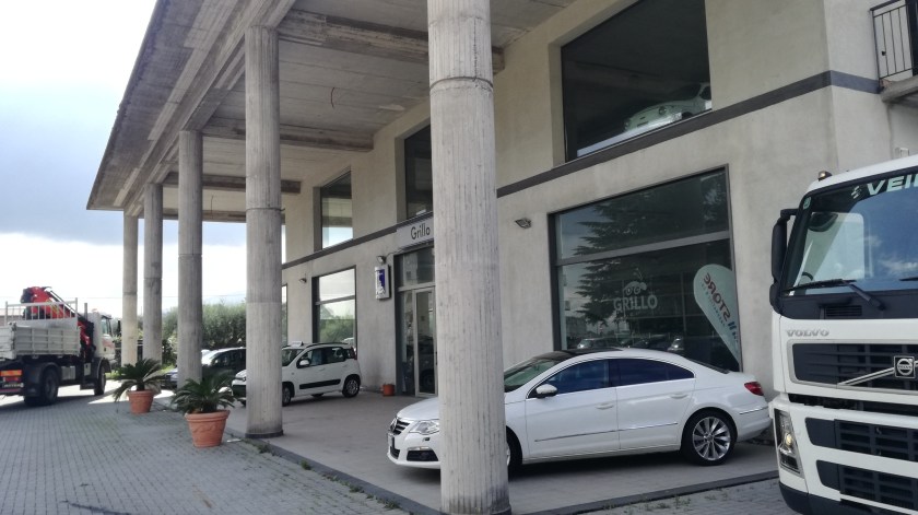 Gli autoarticolati portano in cantiere la termocopertura, in questo caso a “greche”, che con un muletto viene scaricata e accatastata distribuendola in più siti nei duemila metri quadri di superficie del tetto dell’autosalone, nonché officina meccanica, elettrauto, multiservizi.